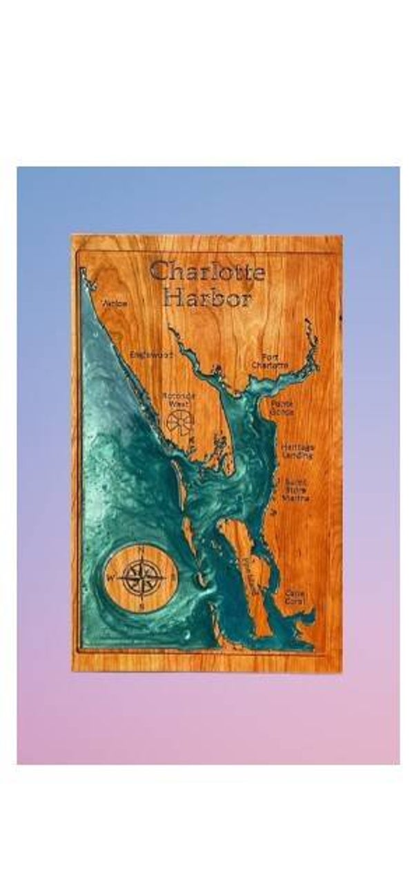 Capture the beauty of Charlotte Harbor with a handcrafted carved map made from your choice of hardwood. Shown here in red oak and cherry, each piece is carved with precision, epoxy filled for lasting color, and built to showcase the unique shoreline and waterways of the area.