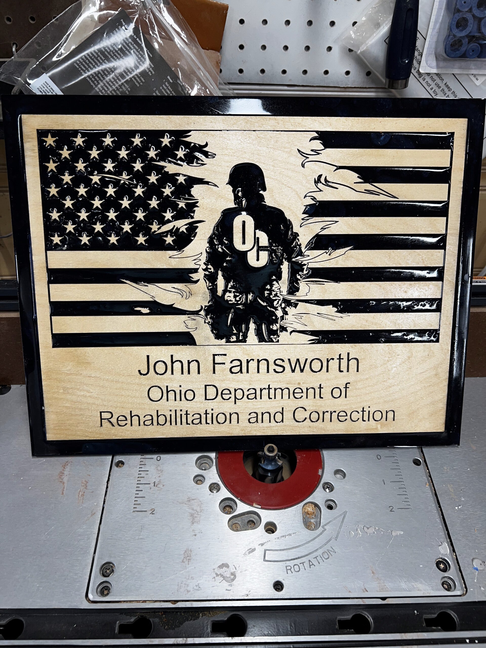 Crafted from 3/4-inch Premium Baltic Birch Plywood, this Ohio Corrections Flag is CNC precision carved and filled with high‑quality epoxy for crisp detail and long‑lasting durability. The epoxy inlay will not peel, fade, or chip like painted items, ensuring your piece looks sharp for years.