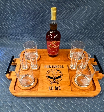 Crafted from premium cherry lumber, this bourbon tray features black anodized aluminum handles and rubber feet to prevent sliding. The tray can be ordered with or without glasses and is designed to hold four bourbon glasses and four double‑shot glasses. All glasses are laser‑etched for a sharp, permanent finish.